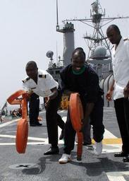 | Keywords: US Navy 090213-N-1655H-237 Africa Partnership Station embarked trainees unroll fire hoses aboard the amphibious transport dock ship USS Nashville (LPD 13) during damage control training.jpg en ATLANTIC OCEAN Feb 13 2009 Africa Partnership Station embarked trainees unroll fire hoses aboard the amphibious transport dock ship USS Nashville LPD 13 during damage control training The west African sailors from Benin Ghana and Togo are embarked aboard Nashville for three weeks Nashville is deployed as part of Africa Partnership Station 2009 an international initiative developed by Naval Forces Europe and Naval Forces Africa which aims to work cooperatively with U S and international partners to enhance maritime safety and security for the continent of Africa U S Navy photo by Mass Communication Specialist 2nd Class David Holmes/Released 2009-02-13 090213-N-1655H-237 Navy http //www navy mil/view_image asp id 68820 U S Navy photo by Mass Communication Specialist 2nd Class David Holmes PD-USGov-Military-Navy Aboard USS Nashville LPD-13 Africa Partnership Station 2009 |