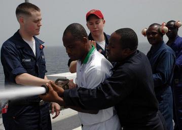 | Keywords: US Navy 090213-N-1655H-020 Africa Partnership Station embarked trainees practice manning a fire hose aboard the amphibious transport dock ship USS Nashville (LPD 13) during damage control training.jpg en ATLANTIC OCEAN Feb 13 2009 Africa Partnership Station embarked trainees practice manning a fire hose aboard the amphibious transport dock ship USS Nashville LPD 13 during damage control training The west African sailors from Benin Ghana and Togo are embarked aboard Nashville for three weeks Nashville is deployed as part of Africa Partnership Station 2009 an international initiative developed by Naval Forces Europe and Naval Forces Africa which aims to work cooperatively with U S and international partners to enhance maritime safety and security for the continent of Africa U S Navy photo by Mass Communication Specialist 2nd Class David Holmes/Released 2009-02-13 090213-N-1655H-020 Navy http //www navy mil/view_image asp id 68801 U S Navy photo by Mass Communication Specialist 2nd Class David Holmes PD-USGov-Military-Navy Aboard USS Nashville LPD-13 Africa Partnership Station 2009 |