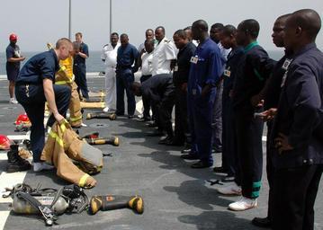 | Keywords: US Navy 090213-N-1655H-002 Africa Partnership Station embarked trainees observe crew members aboard the amphibious transport dock ship USS Nashville (LPD 13) demonstrate the proper donning of a firefighting ensemble during dama.jpg en ATLANTIC OCEAN Feb 13 2009 Africa Partnership Station embarked trainees observe crew members aboard the amphibious transport dock ship USS Nashville LPD 13 demonstrate the proper donning of a firefighting ensemble during damage control training The west African sailors from Benin Ghana and Togo are embarked aboard Nashville for three weeks Nashville is deployed as part of Africa Partnership Station 2009 an international initiative developed by Naval Forces Europe and Naval Forces Africa which aims to work cooperatively with U S and international partners to enhance maritime safety and security for the continent of Africa U S Navy photo by Mass Communication Specialist 2nd Class David Holmes/Released 2009-02-13 090213-N-1655H-002 Navy http //www navy mil/view_image asp id 68819 U S Navy photo by Mass Communication Specialist 2nd Class David Holmes PD-USGov-Military-Navy Aboard USS Nashville LPD-13 Africa Partnership Station 2009 |