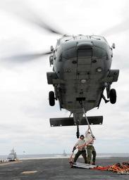 | Keywords: US Navy 090218-N-2636M-146 Marines assigned to the 22d Marine Expeditionary Unit (MEU) latch a net sling to an MH-60S Sea Hawk helicopter during a vertical replenishment aboard the amphibious assault ship USS Bataan (LHD 5).jpg en ATLANTIC OCEAN Feb 18 2009 Marines assigned to the 22d Marine Expeditionary Unit MEU latch a net sling to an MH-60S Sea Hawk helicopter during a vertical replenishment aboard the amphibious assault ship USS Bataan LHD 5 Bataan is counducting composite unit training exercise COMPTUEX off the Virginia coast COMPTUEX is the second of three at-sea training evolutions designed to prepare the strike group for a scheduled deployment later this year U S Navy photo by Mass Communication Specialist 3rd Class Kleynia R McKnight/Release 2009-02-18 090218-N-2636M-146 Navy http //www navy mil/view_image asp id 68925 U S Navy photo PD-USGov-Military-Navy MH-60S helihoisting cargo Aboard USS Bataan LHD-5 |