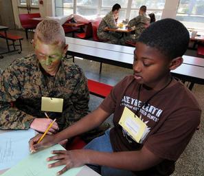 | Keywords: US Navy 090221-N-5328N-140 Saturday Scholar Mentor Pfc. Mathew Alexander, from Hendersonville, N.C., plays tick-tack-toe with a West Pensacola Elementary School Saturday Scholar student.jpg en PENSACOLA Fla Feb 21 2009 Saturday Scholar Mentor Pfc Mathew Alexander from Hendersonville N C plays tick-tack-toe with a West Pensacola Elementary School Saturday Scholar student during the final weekend of mentoring for the 48th session of Saturday Scholars hosted by Center for Information Dominance Corry Station U S Navy photo by Gary Nichols/Released 2009-02-21 090221-N-5328N-140 Navy http //www navy mil/view_image asp id 69395 U S Navy photo by Gary Nichols PD-USGov-Military-Navy Center for Information Dominance Corry Station Camouflage facepainting Mentorship |