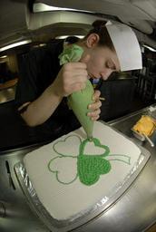| Keywords: US Navy 090317-N-2475A-043 Culinary Specialist 3rd Class Rechele Rosposa, from Bremerton, Wash., decorates a Saint Patrick's Day cake in the ship's bake shop aboard the aircraft carrier USS John C. Stennis (CVN 74).jpg en PACIFIC OCEAN March 17 2009 Culinary Specialist 3rd Class Rechele Rosposa from Bremerton Wash decorates a Saint Patrick's Day cake in the ship's bake shop aboard the aircraft carrier USS John C Stennis CVN 74 John C Stennis is on a scheduled six-month deployment to the western Pacific Ocean U S Navy photo by Mass Communication Specialist 3rd Class Kenneth Abbate/ Released 2009-03-17 090317-N-2475A-043 Navy http //www navy mil/view_image asp id 69743 U S Navy photo by Mass Communication Specialist 3rd Class Kenneth Abbate PD-USGov-Military-Navy Cake decorating Aboard USS John C Stennis CVN-74 Galleys on United States Navy ships Culinary specialist United States Navy Saint Patrick's Day food Pastry bag Four-leaf clover Quatrefoils in food |