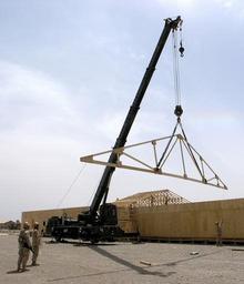 | Keywords: US Navy 090417-N-9599T-027 Seabees use a crane to place trusses on a Southwest Asia hut during a project at forward operating base Leatherneck.jpg en HELMAND PROVINCE Afghanistan April 17 2009 Seabees assigned to Alfa Company Naval Mobile Construction Battalion NMCB 5 use a crane to place trusses on a Southwest Asia hut during a project at forward operating base Leatherneck NMCB-5 is deployed to Afghanistan supporting the NATO International Security Assistance Force NMCB-5 is one of the Naval Expeditionary Combat Command warfighting support elements providing host nation construction support and security U S Navy photo by Lt Michael Tomsik/Released 2009-04-17 090417-N-9599T-027 Navy http //www navy mil/view_image asp id 70818 U S Navy photo by Lt Michael Tomsik PD-USGov-Military-Navy Helmand Province in the War in Afghanistan 2001-present Timber construction Naval Mobile Construction Battalion 5 Mobile cranes |