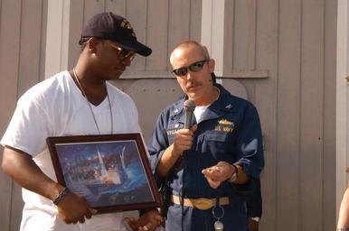 | Keywords: US Navy 090420-N-1117B-423 Capt. John C. Nygaard, commanding officer of guided-missile cruiser USS Vicksburg (CG 69), presents performing artist, Yung Joc, with a belt buckle carrying the ships motto.jpg en ARABIAN SEA April 20 2009 Capt John C Nygaard commanding officer of guided-missile cruiser USS Vicksburg CG 69 presents performing artist Yung Joc with a belt buckle carrying the ships motto American Muscle during a visit to the Vicksburg and the aircraft carrier USS Dwight D Eisenhower CVN 69 The Eisenhower Carrier Strike Group is underway for a scheduled deployment supporting the on-going rotation of forward-deployed forces to support maritime security operations and operate in international waters across the globe U S Navy photo by Mass Communication Specialist Seaman Christopher A Baker/Released 2009-04-20 090420-N-1117B-423 Navy http //www navy mil/view_image asp id 70781 U S Navy photo by Mass Communication Specialist Seaman Christopher A Baker PD-USGov-Military-Navy Aboard USS Dwight D Eisenhower CVN-69 |