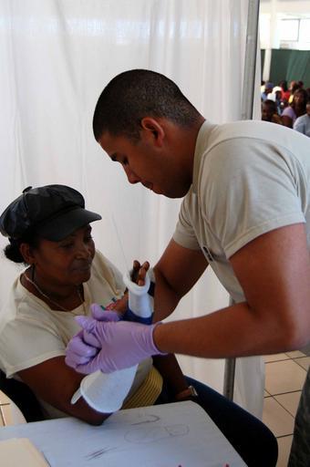 | Keywords: US Navy 090508-F-7885G-021 Staff Sgt. Hugo Reiner, a physical therapy craftsman aboard the Military Sealift Command hospital ship USNS Comfort (T-AH 20), makes a wrist brace for Teresa De la Pena during a Continuing Promise 200.jpg en ST JOHN'S Antigua May 8 2009 Staff Sgt Hugo Reiner a physical therapy craftsman aboard the Military Sealift Command hospital ship USNS Comfort T-AH 20 makes a wrist brace for Teresa De la Pena during a Continuing Promise 2009 medical community service project Comfort is participating in the Continuing Promise 2009 four-month humanitarian and civic assistance mission to Latin America and the Caribbean U S Air Force photo by Airman 1st Class Danielle Grannan/Released 2009-05-08 090508-F-7885G-021 Navy http //www navy mil/view_image asp id 71481 U S Air Force photo by Airman 1st Class Danielle Grannan PD-USGov-Military-Navy Images from US Navy location St John's Antigua Aboard USNS Comfort T-AH-20 |