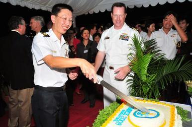 | Keywords: US Navy 090514-N-1488S-067 Commanding Officer of Arleigh Burke-class guided missile destroyer USS Kidd (DDG 100), Cmdr. Chuck Good, participates in a cake cutting ceremony with Chief of Republic of Singapore Navy, Rear Adm. Che.jpg en SINGAPORE CITY Singapore May 13 2009 Commanding Officer of Arleigh Burke-class guided missile destroyer USS Kidd DDG 100 Cmdr Chuck Good participates in a cake cutting ceremony with Chief of Republic of Singapore Navy Rear Adm Chew Men Leong during the International Maritime Defense Exhibition Asia 2009 a biennial conference showcasing the latest in maritime defense technology Kidd is part of John C Stennis Carrier Strike Group and is in Singapore for a port visit as part of a scheduled six-month deployment to the western Pacific Ocean U S Navy photo by Ensign Alexis F Steele/Released 2009-05-13 090514-N-1488S-067 Navy http //www navy mil/view_image asp id 71620 U S Navy photo by Ensign Alexis F Steele PD-USGov-Military-Navy Naval ships of the United States in Singapore Aboard USS Kidd DDG-100 Cake cutting Chew Men Leong |