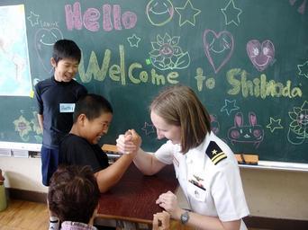 | Keywords: US Navy 090515-N-1334U-001 Lt. j.g. Mary Robinson arm wrestles with a 6th grader from Shimoda Elementary School in Shimoda, Japan.jpg en SHIMODA Japan May 15 2009 Lt j g Mary Robinson assigned to Helicopter Anti-submarine Squadron Light HSL 51 Detachment 5 embarked aboard the guided-missile destroyer USS McCampbell DDG 85 arm wrestles with a 6th grader from Shimoda Elementary School in Shimoda Japan McCampbell was in Shimoda for the 70th Black Ship Festival held every year to commemorate the 1854 landing of Commodore Matthew Perry at Shimoda and the subsequent opening of trade between Japan and the West U S Navy photo by Chief Information Systems Technician Kufere Usanga/Released 2009-05-15 090515-N-1334U-001 Navy http //www navy mil/view_image asp id 71753 U S Navy photo by Chief Information Systems Technician Kufere Usanga PD-USGov-Military-Navy Images from US Navy location SHIMODA Japan Aboard USS McCampbell DDG-85 Arm wrestling |