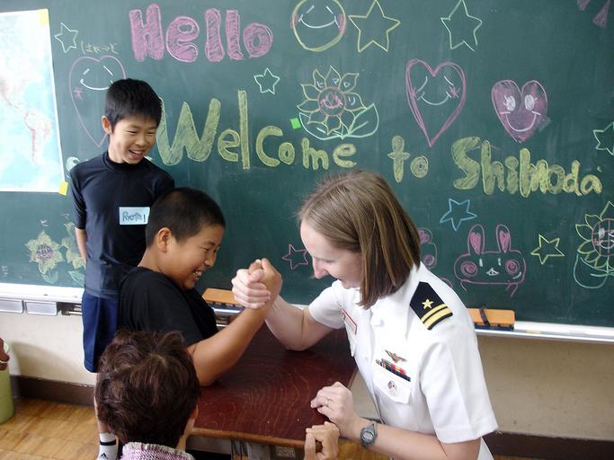 Keywords: US Navy 090515-N-1334U-001 Lt. j.g. Mary Robinson arm wrestles with a 6th grader from Shimoda Elementary School in Shimoda, Japan.jpg en SHIMODA Japan May 15 2009 Lt j g Mary Robinson assigned to Helicopter Anti-submarine Squadron Light HSL 51 Detachment 5 embarked aboard the guided-missile destroyer USS McCampbell DDG 85 arm wrestles with a 6th grader from Shimoda Elementary School in Shimoda Japan McCampbell was in Shimoda for the 70th Black Ship Festival held every year to commemorate the 1854 landing of Commodore Matthew Perry at Shimoda and the subsequent opening of trade between Japan and the West U S Navy photo by Chief Information Systems Technician Kufere Usanga/Released 2009-05-15 090515-N-1334U-001 Navy http //www navy mil/view_image asp id 71753 U S Navy photo by Chief Information Systems Technician Kufere Usanga PD-USGov-Military-Navy Images from US Navy location SHIMODA Japan Aboard USS McCampbell DDG-85 Arm wrestling