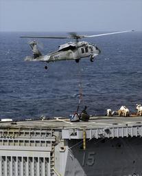 | Keywords: US Navy 090523-N-5345W-183 An MH-60S Sea Hawk helicopter assigned to the Sea Knights of Helicopter Combat Support Squadron (HSC) 22 delivers a load of stores to the flight deck of the amphibious transport dock ship USS Ponce (L.jpg en ATLANTIC OCEAN May 23 2009 An MH-60S Sea Hawk helicopter assigned to the Sea Knights of Helicopter Combat Support Squadron HSC 22 delivers a load of stores to the flight deck of the amphibious transport dock ship USS Ponce LPD 15 during a vertical replenishment with the military sealift command fleet replenishment oiler USNS John Lenthall T-AO 189 Fort McHenry is on a scheduled deployment with the Bataan Amphibious Readiness Group ARG supporting maritime security operations in the U S 5th and 6th Fleet areas of responsibility U S Navy photo by Mass Communication Specialist 2nd Class Kristopher Wilson/Released 2009-05-23 090523-N-5345W-183 Navy http //www navy mil/view_image asp id 72127 U S Navy photo by Mass Communication Specialist 2nd Class Kristopher Wilson PD-USGov-Military-Navy MH-60S Seahawk Aboard USS Ponce LPD-15 Helicopter Sea Combat Squadron 22 United States Navy |