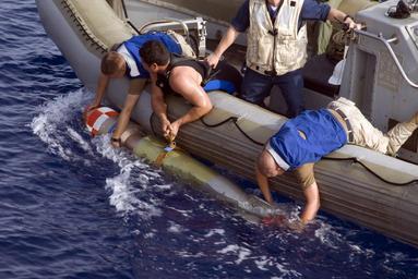 | Keywords: US Navy 090526-N-0743B-028 ailors aboard the guided-missile cruiser USS Gettysburg (CG 64) recover an Mk-46 recoverable exercise torpedo (REXTORP) during an over-the-side surface vessel torpedo tube exercise.jpg en GULF OF ADEN May 26 2009 Sailors aboard the guided-missile cruiser USS Gettysburg CG 64 recover an Mk-46 recoverable exercise torpedo REXTORP during an over-the-side surface vessel torpedo tube exercise The exercise allows the crew to remain proficient in the use of the weapon Gettysburg is part of Combined Task Force CTF 151 a multinational task force established to conduct counter-piracy operations under a mission-based mandate throughout the CMF area of responsibility U S Navy photo by Mass Communication Specialist 1st Class Eric L Beauregard/Released 2009-05-26 090526-N-0743B-028 Navy http //www navy mil/view_image asp id 72318 U S Navy photo by Mass Communication Specialist 1st Class Eric L Beauregard PD-USGov-Military-Navy Mark 46 torpedo Aboard USS Gettysburg CG-64 |