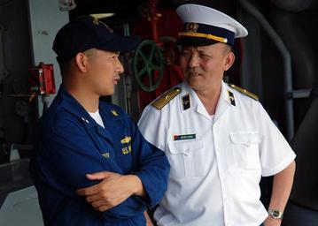 | Keywords: US Navy 090611-N-5207L-183 Vietnamese People's Navy Rear Adm. Do Viet Cuong, one of three observers.jpg en SINGAPORE June 11 2009 Vietnamese People's Navy Rear Adm Do Viet Cuong one of three observers from Vietnam aboard the amphibious dock landing ship USS Harpers Ferry LSD 49 for Cooperation Afloat Readiness and Training CARAT 2009 speaks with Lt Thuan Nguyen the supply officer aboard Harpers Ferry CARAT is a series of bilateral exercises held annually in Southeast Asia to strengthen relationships and enhance the operational readiness of the participating forces U S Navy photo by Mass Communication Specialist 1st Class Bill Larned/Released 2009-06-11 090611-N-5207L-183 Navy http //www navy mil/view_image asp id 72575 U S Navy photo by Mass Communication Specialist 1st Class Bill Larned PD-USGov-Military-Navy Naval ships of the United States in Singapore Aboard USS Harpers Ferry LSD-49 |