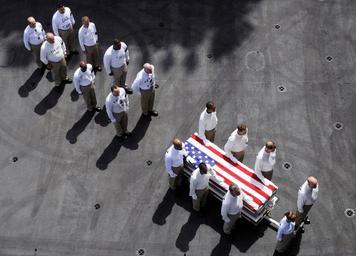 | Keywords: US Navy 090622-N-6854D-001 Chief petty officers assigned to Carrier Air Wing (CVW) 7 carry the casket of Command Master Chief Jeffrey J. Garber.jpg en ARABIAN SEA June 22 2009 Chief petty officers assigned to Carrier Air Wing CVW 7 carry the casket of Command Master Chief Jeffrey J Garber during a departure ceremony aboard the aircraft carrier USS Dwight D Eisenhower CVN 69 Garber CVW-7 command master chief died June 20 of apparent natural causes while deployed aboard the aircraft carrier He was 43 The Eisenhower Carrier Strike Group is deployed to the U S 5th Fleet area of responsibility supporting operations Enduring Freedom and Iraqi Freedom as well as maritime security operations U S Navy photo/Released 2009-06-22 090622-N-6854D-001 Navy http //www navy mil/view_image asp id 72961 U S Navy photo PD-USGov-Military-Navy Flight deck of USS Dwight D Eisenhower CVN-69 Dignified Transfers |
