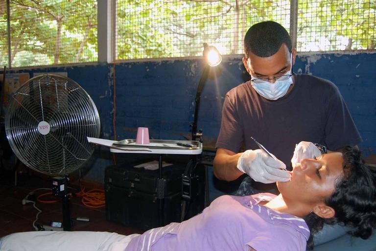 Keywords: US Navy 090625-F-7522G-001 Hospital Corpsman 3rd Class Frederick Duran cleans and scales a Salvadoran patient's teeth during a Continuing Promise 2009 medical community service project.jpg en LA UNION El Salvador June 25 2009 Hospital Corpsman 3rd Class Frederick Duran a dental technician assigned to the Military Sealift Command hospital ship USNS Comfort T-AH 20 cleans and scales a Salvadoran patient's teeth during a Continuing Promise 2009 medical community service project at Loma Larga school Continuing Promise is a four-month humanitarian and civic assistance mission to seven countries in Latin America and the Caribbean Comfort is scheduled to be in El Salvador until July 2 U S Air Force photo by Airman 1st Class Ashley Garcia/Released 2009-06-25 090625-F-7522G-001 Navy http //www navy mil/view_image asp id 73110 U S Air Force photo by Airman 1st Class Ashley Garcia PD-USGov-Military-Navy Pasaquina El Salvador Healthcare in El Salvador USNS Comfort in El Salvador 2009 Images from US Navy location Pasaquina El Salvador
