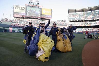 | Keywords: US Navy 090702-N-5366K-249 pecial Warfare Operator 1st Class (SEAL) Robert Darakjy, assigned to the U.S. Navy Parachute Team the Leap Frogs, waves to spectators after the Team gave a parachute demonstration during the opening c.jpg en ANAHEIM Calif July 2 2009 Special Warfare Operator 1st Class SEAL Robert Darakjy assigned to the U S Navy Parachute Team the Leap Frogs waves to spectators after the Team gave a parachute demonstration during the opening ceremony of an Anaheim Angels baseball game at Angel Stadium More than 40 000 people attended the event and were able to meet the Team after the performance The Leap Frogs are based in San Diego and perform at various locations across the country to showcase Navy excellence and raise awareness about Naval Special Warfare U S Navy photo by Mass Communication Specialist 2nd Class Michelle Kapica/Released 2009-07-02 090702-N-5366K-249 Navy http //www navy mil/view_image asp id 73454 U S Navy photo by Mass Communication Specialist 2nd Class Michelle Kapica PD-USGov-Military-Navy Angel Stadium of Anaheim 2009 Los Angeles Angels of Anaheim season United States Navy Parachute Team |