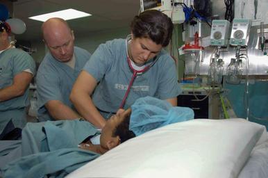 | Keywords: US Navy 090706-A-0566T-020 Lt. Kendra Pennington and Sgt. Dustin Turvild check the vital signs of a patient in the post anesthetic care unit aboard the hospital ship USNS Comfort (T-AH 20).jpg en CORINTO Nicaragua July 6 2009 Lt Kendra Pennington and Sgt Dustin Turvild check the vital signs of a patient in the post anesthetic care unit aboard the hospital ship USNS Comfort T-AH 20 Comfort is supporting Continuing Promise 2009 a four-month humanitarian and civic assistance mission to Latin America and the Caribbean U S Army photo by Spc Nashaunda Tilghman/Released 2009-07-06 090706-A-0566T-020 Navy http //www navy mil/view_image asp id 73541 U S Army photo by Spc Nashaunda Tilghman PD-USGov-Military-Navy Corinto Nicaragua Images from US Navy location CORINTO Nicaragua Aboard USNS Comfort T-AH-20 |