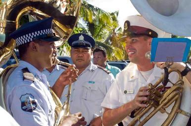 | Keywords: US Navy 090706-N-9689V-001 Chief Musician Brian Chaplow, a member of the Pacific Fleet Band embarked with Pacific Partnership 2009, practices with members of the Royal Samoan Police Band before marching in a parade honoring Nat.jpg en UPOLU Samoa July 6 2009 Chief Musician Brian Chaplow a member of the Pacific Fleet Band embarked with Pacific Partnership 2009 practices with members of the Royal Samoan Police Band before marching in a parade honoring National Library Week Pacific Partnership is a humanitarian and civil assistance mission in the Pacific Fleet area of responsibility This year Pacific Partnership will travel to Oceania including Kiribati Republic of the Marshall Islands Samoa Solomon Islands and Tonga The Military Sealift Command dry cargo/ammunition ship USNS Richard E Byrd T-AKE 4 serves as the enabling platform for Pacific Partnership U S Navy photo by Mass Communication Specialist 2nd Class Joshua Valcarcel/Released 2009-07-06 090706-N-9689V-001 Navy http //www navy mil/view_image asp id 73516 U S Navy photo by Mass Communication Specialist 2nd Class Joshua Valcarcel PD-USGov-Military-Navy Images from US Navy location UPOLU Samoa |