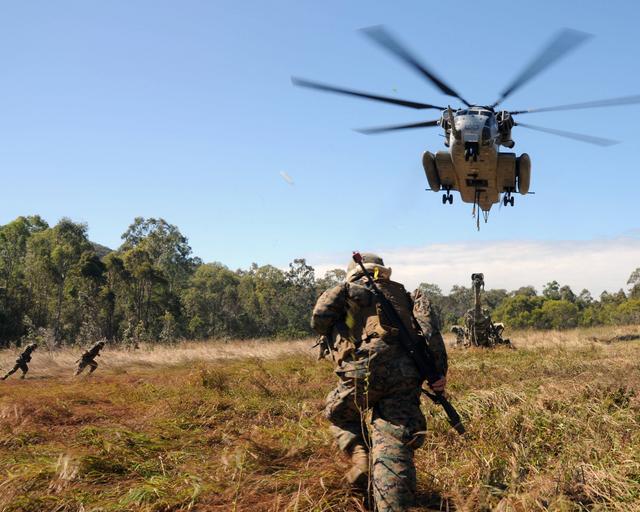 | Keywords: US Navy 090719-N-0120A-487 Marines assigned to the 31st Marine Expeditionary Unit, embarked aboard the forward-deployed amphibious assault ship USS Essex (LHD 2), rush toward an M777 105mm lightweight Howitzer.jpg en SHOALWATER BAY Australia July 19 2009 Marines assigned to the 31st Marine Expeditionary Unit embarked aboard the forward-deployed amphibious assault ship USS Essex LHD 2 rush toward an M777 155mm lightweight Howitzer for rig it for lift by an MH-53E Sea Stallion helicopter assigned to the Air Combat Element of the 31st MEU as a part of exercise Talisman Saber 2009 Talisman Saber is a biennial combined training activity designed to train Australian and U S forces in planning and conducting combined operations which will help improve combat readiness and interoperability between Australian and U S forces U S Navy photo by Mass Communication Specialist 2nd Class Mark R Alvarez/Released 2009-07-19 090719-N-0120A-487 Navy http //www navy mil/view_image asp id 74089 U S Navy photo by Mass Communication Specialist 2nd Class Mark R Alvarez PD-USGov-Military-Navy Shoalwater Bay Aboard USS Essex LHD-2 Talisman Sabre 2009 M777 howitzer |