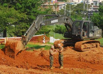 | Keywords: US Navy 090826-N-9573A-002 eabees assigned to Naval Mobile Construction Battalion (NMCB) 1 level the land for a sports complex.jpg en CHINHAE Republic of Korea Aug 26 2009 Seabees assigned to Naval Mobile Construction Battalion NMCB 1 level the land for a sports complex The facility will include volleyball and tennis courts and will be used by more than 100 Sailors and their families stationed at Commander Fleet Activities Chinhae CFAC CFAC is the only U S Navy base in the Republic of Korea U S Navy photo by Mass Communication Specialist 1st Class Bobbie G Attaway/Released 2009-08-26 090826-N-9573A-002 Navy http //www navy mil/view_image asp id 75589 U S Navy photo by Mass Communication Specialist 1st Class Bobbie G Attaway PD-USGov-Military-Navy Images from US Navy location Jinhae South Korea John Deere excavators Naval Mobile Construction Battalion 1 |