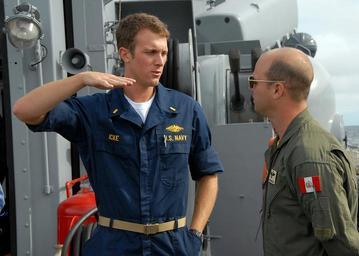 | Keywords: US Navy 090916-N-2821G-216 Ensign Eric Icke speaks with Peruvian navy Capt. de Corbetta Alex Arriaran Schaffer about flight operation capabilities of the Peruvian navy frigate BAP Quinones (FM 58).jpg en PACIFIC OCEAN Sept 16 2009 Ensign Eric Icke speaks with Peruvian navy Capt de Corbetta Alex Arriaran Schaffer about flight operation capabilities of the Peruvian navy frigate BAP Quinones FM 58 Schaffer is an AB 212 helicopter pilot Icke is a U S Navy Reserve Merchant Marine officer serving as the target vessel control operator aboard Quinones during the multinational training exercise Fuerzas Aliadas PANAMAX 2009 PANAMAX is a multinational exercise involving more than 4 500 personnel from 20 participating countries tailored to the defense of the Panama Canal U S Navy photo by Mass Communication Specialist 2nd Class Alan Gragg/Released 2009-09-16 090916-N-2821G-216 Navy http //www navy mil/view_image asp id 76333 U S Navy photo by Mass Communication Specialist 2nd Class Alan Gragg PD-USGov-Military-Navy PANAMAX 2009 Navy of Peru |