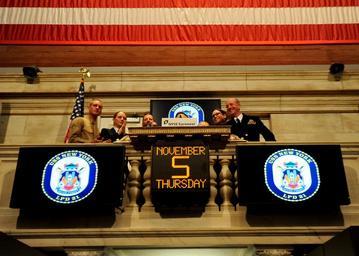 MAKE A MEME View Large Image Navy 091105-N-2147L-001 Cmdr. Erich Schmidt, executive officer of the amphibious transport dock ship Pre-commissioning Unit (PCU) New York (LPD 21), and crew members ring the closing bell at the New York Stock Exchange.jpg en NEW YORK Nov 5 ...