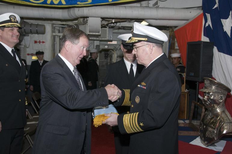 | Keywords: US Navy 091204-N-0757M-001 Adm. J.C. Harvey Jr., commander of U.S. Fleet Forces Command, presents the Medal of Honor flag to retired Capt. Peter Bulkeley.jpg en NORFOLK Dec 4 2009 Adm J C Harvey Jr commander of U S Fleet Forces Command presents the Medal of Honor flag to retired Capt Peter Bulkeley son of Medal of Honor recipient Vice Adm John Duncan Bulkeley during a ceremony aboard the guided-missile destroyer USS Bulkeley DDG 84 U S Navy photo by Mass Communication Specialist 1st Class Bleu Moore/Reeased 2009-12-04 091204-N-0757M-001 Navy http //www navy mil/view_image asp id 79111 U S Navy photo PD-USGov-Military-Navy USS Bulkeley DDG-84 John C Harvey Jr Handshakes involving the military |