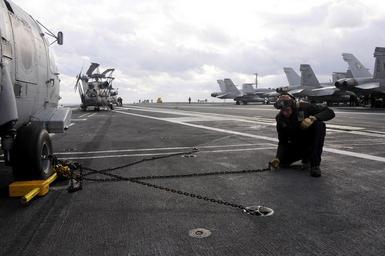 | Keywords: US Navy 100105-N-6604E-007 Aviation Machinist's Mate Airman John Wagner connects a tiedown chain to a padeye on the flight deck of the aircraft carrier USS Dwight D. Eisenhower (CVN 69).jpg en ATLANTIC OCEAN Jan 5 2010 Aviation Machinist's Mate Airman John Wagner connects a tiedown chain to a padeye on the flight deck of the aircraft carrier USS Dwight D Eisenhower CVN 69 Dwight D Eisenhower is on a six-month deployment as a part of the on-going rotation of forward-deployed forces to support maritime security operations U S Navy photo by Mass Communication Specialist 3rd Class Bradley Evans/Released 2010-01-05 100105-N-6604E-007 Navy http //www navy mil/view_image asp id 79659 U S Navy photo by Mass Communication Specialist 3rd Class Bradley Evans PD-USGov-Military-Navy Flight deck of USS Dwight D Eisenhower CVN-69 |