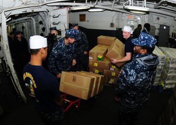 | Keywords: US Navy 100114-N-7508R-004 Sailors aboard USS Bataan (LHD 5) off load supplies in the ship's hangar bay.jpg en NORFOLK Jan 14 2010 Sailors aboard the multipurpose amphibious assault ship USS Bataan LHD 5 off load supplies in the ship's hangar bay as Bataan prepares to depart Naval Station Norfolk to provide humanitarian assistance in the aftermath of a 7 0 magnitude earthquake near Port-au-Prince Haiti U S Navy photo by Mass Communication Specialist Julio N Rivera/Released 2010-01-14 100114-N-7508R-004 Navy http //www navy mil/view_image asp id 79882 U S Navy photo by Mass Communication Specialist Julio N Rivera PD-USGov-Military-Navy Aboard USS Bataan LHD-5 |