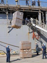 | Keywords: US Navy 100124-N-5688F-014 Sailors load pallets of humanitarian supplies aboard the amphibious dock landing ship USS Carter Hall (LSD 50) at U.S. Naval Station Guantanamo Bay, Cuba.jpg en GUANTANAMO BAY Cuba Jan 24 2010 Sailors load pallets of humanitarian supplies aboard the amphibious dock landing ship USS Carter Hall LSD 50 at U S Naval Station Guantanamo Bay Cuba Carter Hall is transporting U S Marines and supplies from Combat Logistics Battalion CLB 22 to support Operation Unified Response a multi-national humanitarian and disaster relief operation following a 7 0 magnitude earthquake in Haiti Jan 12 U S Navy photo by Mass Communication Specialist 2nd Class Edward Flynn/Released 2010-01-24 100124-N-5688F-014 Navy http //www navy mil/view_image asp id 80796 U S Navy photo by Mass Communication Specialist 2nd Class Edward Flynn PD-USGov-Military-Navy Aboard USS Carter Hall LSD-50 |