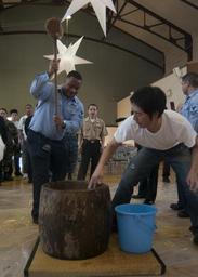 | Keywords: US Navy 100129-N-5253W-003 Fleet Activities Yokosuka celebrates the new year.jpg en YOKOSUKA Japan Jan 29 2010 Operations Specialist 2nd Class Tyrone Hill from Atlanta pounds mochi during Fleet Activities Yokosuka's New Year's mochi pounding celebration The event commemorated the 50th anniversary the U S Japan strategic alliance Mochi a paste used in many Japanese foods is traditionally made by beating specially-prepared rice with a mallet and mortar U S Navy photo by Mass Communication Specialist 2nd Class Gabriel S Weber/Released 2010-01-29 100129-N-5253W-003 Navy http //www navy mil/view_image asp id 81210 U S Navy photo by Mass Communication Specialist 2nd Class Gabriel S Weber PD-USGov-Military-Navy United States Fleet Activities Yokosuka Mochi pounding |