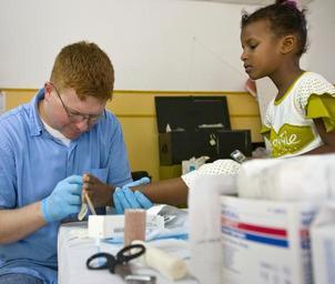 Keywords: US Navy 100130-N-1385G-007 Lt. j.g. Michael Rucker, assigned to Combined Joint Task Force Horn of Africa, treats the infected feet of a 7-year-old Djibouti girl at the Caritas Djibouti complex in Djibouti. Rucker volunteers his.jpg en CAMP LEMONNIER Djibouti Jan 30 2010 Lt j g Michael Rucker assigned to Combined Joint Task Force Horn of Africa treats the infected feet of a 7-year-old Djibouti girl at the Caritas Djibouti complex in Djibouti Rucker volunteers his medical services most weekends at the clinic U S Navy photo by Chief Mass Communication Specialist Robert P Gallagher/Released 2010-01-30 100130-N-1385G-007 Navy http //www navy mil/view_image asp id 87402 U S Navy photo by Chief Mass Communication Specialist Robert P Gallagher PD-USGov-Military-Navy Camp Lemonnier Human feet Blue shirts Male red hair