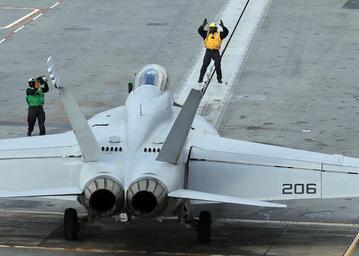 | Keywords: US Navy 100203-N-3885H-005 Flight deck personnel direct an F-A-18F Super Hornet from Strike Fighter Squadron (VFA) 213 aboard the aircraft carrier USS George H.W. Bush (CVN 77).jpg en ATLANTIC OCEAN Feb 3 2010 Flight deck personnel direct an F/A-18F Super Hornet from Strike Fighter Squadron VFA 213 aboard the aircraft carrier USS George H W Bush CVN 77 Bush the Navy's 10th and final Nimitz-class aircraft carrier is underway in the Atlantic Ocean a conducting flight deck certification U S Navy photo by Mass Communication Specialist 3rd Class Nicholas Hall/Released 2010-02-03 100203-N-3885H-005 Navy http //www navy mil/view_image asp id 81434 U S Navy photo by Mass Communication Specialist 3rd Class Nicholas Hall PD-USGov-Military-Navy Aboard USS George H W Bush CVN-77 Strike Fighter Squadron 213 United States Navy F/A-18F Super Hornet on flight decks |
