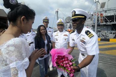 | Keywords: US Navy 100215-N-8335D-235 A Cambodian woman presents flowers to Lt. Cmdr. Walter Mainor.jpg en SIHANOUKVILLE Cambodia Feb 15 2010 A Cambodian woman presents flowers to Lt Cmdr Walter Mainor commanding officer of the mine counter-measures ship USS Patriot MCM 7 after Patriot moored in Sihanoukville for a week-long port visit Patriot will conduct training with the Royal Cambodian Navy and participate in community service projects U S Navy photo by Mass Communication Specialist 1st Class Richard Doolin/Released 2010-02-15 100215-N-8335D-235 Navy http //www navy mil/view_image asp id 81985 U S Navy photo by Mass Communication Specialist 1st Class Richard Doolin PD-USGov-Military-Navy USS Patriot MCM-7 |