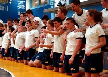 | Keywords: US Navy 100217-N-3857R-028 U.S. Naval Academy midshipmen are taught how to execute a rear choke.jpg en ANNAPOLIS Md Feb 17 2010 U S Naval Academy midshipmen are taught how to execute a rear choke during a physical education class Martial arts is one of three skills that midshipmen will learn to build close-range combative skills The physical education department also uses boxing and wrestling to develop the concept of courage under stress in all midshipmen U S Navy photo by Mass Communication Specialist 1st Class Chad Runge/Released 2010-02-17 100217-N-3857R-028 Navy http //www navy mil/view_image asp id 82078 U S Navy photo by Mass Communication Specialist 1st Class Chad Runge PD-USGov-Military-Navy United States Naval Academy Rear naked chokes |