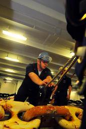 | Keywords: US Navy 100226-N-2953W-378 Boatswain's Mate 2nd Class Brandon Terry reapplies a pelican hook to the anchor chain in the forecastle of the aircraft carrier USS Carl Vinson (CVN 70).jpg en RIO DE JANEIRO Brazil Feb 26 2010 Boatswain's Mate 2nd Class Brandon Terry reapplies a pelican hook to the anchor chain in the forecastle of the aircraft carrier USS Carl Vinson CVN 70 as the ship arrives in Rio de Janeiro Brazil for a port visit Carl Vinson is taking part in Southern Seas 2010 as part of a scheduled homeport shift U S Navy photo by Mass Communication Specialist 2nd Class Adrian White/Released 2010-02-26 100226-N-2953W-378 Navy http //www navy mil/view_image asp id 82505 U S Navy photo by Mass Communication Specialist 2nd Class Adrian White PD-USGov-Military-Navy Aboard USS Carl Vinson CVN-70 Anchor chains |