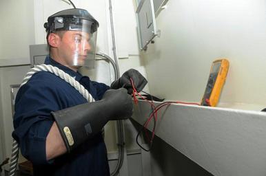 | Keywords: US Navy 100308-N-4997L-001 Electrician's Mate 2nd Class Corey Hartley checks voltage with a multi-meter aboard the aircraft carrier USS Abraham Lincoln (CVN 72).jpg en PACIFIC OCEAN March 8 2010 Electrician's Mate 2nd Class Corey Hartley checks voltage with a multi-meter aboard the aircraft carrier USS Abraham Lincoln CVN 72 Hartley is wearing a face shield rubber gloves and a life-line for safety while working with electrical equipment U S Navy photo by Mass Communication Specialist Seaman Jerine Lee/Released 2010-03-08 100308-N-4997L-001 Navy http //www navy mil/view_image asp id 84577 U S Navy photo by Mass Communication Specialist Seaman Jerine Lee PD-USGov-Military-Navy Aboard USS Abraham Lincoln CVN-72 Electrician's Mate Face shields Rubber gloves |