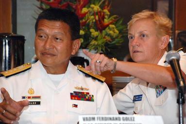| Keywords: US Navy 100407-N-7095C-049 Rear Adm. Nora Tyson, right, commander of Logistics Group Western Pacific-Task Force 73, and Vice Adm. Ferdinand Golez, Flag Officer in Command of the Philippine Navy start the Southeast Asian Maritim.jpg en MANILA April 7 2010 Rear Adm Nora Tyson right commander of Logistics Group Western Pacific/Task Force 73 and Vice Adm Ferdinand Golez Flag Officer in Command of the Philippine Navy start the Southeast Asian Maritime Security Senior Leaders Seminar in Manila The seminar is co-hosted by the U S and Philippine navies and focuses on the importance of cooperation and preparation for humanitarian assistance and disaster relief operations Representatives from Brunei Darussalam Cambodia Indonesia Malaysia Singapore Thailand and Vietnam are also participating in the annual meeting U S Navy photo by Mass Communication Specialist 2nd Class Seth Clarke/Released 2010-04-07 100407-N-7095C-049 Navy http //www navy mil/view_image asp id 84090 U S Navy photo by Mass Communication Specialist 2nd Class Seth Clarke PD-USGov-Military-Navy Images from US Navy location Manila Republic of the Philippines Nora Tyson |