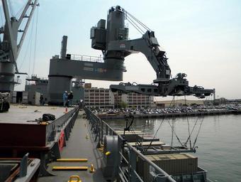 | Keywords: US Navy 100414-N-0000H-001 The Office of Naval Research tests their Large Vessel Interface Lift-on-Lift-off (LVI Lo-Lo) crane at Naval Station Norfolk.jpg en NORFOLK April 14 2010 The Office of Naval Research tests their Large Vessel Interface Lift-on/Lift-off LVI Lo/Lo crane at Naval Station Norfolk The demonstrator crane which has been temporarily installed on the Maritime Administration ship SS Flickertail State T-ACS 5 uses motion-sensing technology to control standard 20-foot containers in all six degrees of freedom U S Navy photo/Released 2010-04-14 100414-N-0000H-001 Navy http //www navy mil/view_image asp id 84374 U S Navy photo PD-USGov-Military-Navy Naval Station Norfolk Flickertail State ship 1965 |