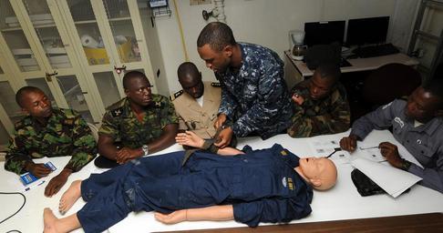 | Keywords: US Navy 100416-N-6676S-002 Hospital Corpsman 1st Class Jason Ashmeade, center, from Long Island, N.Y., demonstrates to service members from the Senegal, Liberia, Sierra Leone, Gambia and Equatorial Guinea armed forces the prope.jpg en DAKAR Senegal April 16 2010 Hospital Corpsman 1st Class Jason Ashmeade center from Long Island N Y demonstrates to service members from the Senegal Liberia Sierra Leone Gambia and Equatorial Guinea armed forces the proper procedures for applying a tourniquet in a combat environment Ashmeade an instructor for Africa Partnership Station West is embarked aboard the Whidbey Island-class amphibious dock landing ship USS Gunston Hall LSD 44 Gunston Hall is on a scheduled deployment supporting Africa Partnership Station an international initiative developed by U S Naval Forces Europe-Africa to improve maritime safety and security on the African continent U S Navy photo by Mass Communication Specialist 2nd Class John Stratton/Released 2010-04-16 100416-N-6676S-002 Navy http //www navy mil/view_image asp id 84543 U S Navy photo by Mass Communication Specialist 2nd Class John Stratton PD-USGov-Military-Navy Aboard USS Gunston Hall LSD-44 2010 in Gambia Tourniquets Africa Partnership Station 2010 |