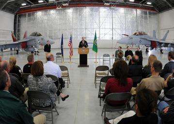 | Keywords: US Navy 100524-N-9860Y-004 Ribbon cutting ceremony at Naval Air Station Whidbey Island.jpg en OAK HARBOR Wash May 24 2010 Rear Adm James Symonds commander of Navy Region Northwest speaks during a ribbon-cutting ceremony to commemorate the completion of Hangar 5's recapitalization at Naval Air Station NAS Whidbey Island The 55 8 million design-build project began in January 2008 The completed facility will house five EA-18G Growler squadrons the Electronic Attack Weapons School and Commander Electronic Attack Wing U S Pacific Fleet U S Navy photo by Mass Communication Specialist 2nd Class Tucker M Yates/Released 2010-05-24 100524-N-9860Y-004 Navy http //www navy mil/view_image asp id 85886 U S Navy photo by Mass Communication Specialist 2nd Class Tucker M Yates PD-USGov-Military-Navy Boeing EA-18G Growler Electronic Attack Squadron 129 United States Navy Electronic Attack Squadron 132 United States Navy Naval Air Station Whidbey Island |