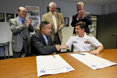 | Keywords: US Navy 100604-N-8863V-051 Dr. H. Keith Moo-Young and Capt. Jay Kadowaki shake hands after signing an Education Partnership Agreement.jpg en LOS ANGELES June 4 2010 Dr H Keith Moo-Young dean at the College of Engineering Computer Science and Technology at California State University Los Angeles left and Capt Jay Kadowaki commanding officer of Naval Surface Warfare Center NSWC Corona Division shake hands after signing an Education Partnership Agreement The agreement provides students an opportunity to develop interest and expertise in real-world technical applications required by the U S Navy and aid NSWC Corona in executing its mission through accessing technology to solve technical problems and recruit the next generation of scientists and engineers U S Navy photo by Greg Vojtko/Released 2010-06-04 100604-N-8863V-051 Navy http //www navy mil/view_image asp id 86575 U S Navy photo by Greg Vojtko PD-USGov-Military-Navy 2010 in Los Angeles |