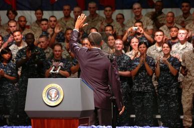 | Keywords: US Navy 100615-N-4482V-006 President Barack Obama waves to the audience after discussing efforts to contain the oil spill in the Gulf of Mexico.jpg en PENSACOLA Fla June 15 2010 President Barack Obama waves to the audience after discussing efforts to contain the oil spill in the Gulf of Mexico with Sailors and Marines at the Naval Air Technical Training Center onboard Naval Air Station Pensacola He also spoke about the role the new Sailors and Marines have in defending America U S Navy photo by Steve Vanderwerff/Released 2010-06-15 100615-N-4482V-006 Navy http //www navy mil/view_image asp id 87085 U S Navy photo by Steve Vanderwerff PD-USGov-Military-Navy Barack Obama in 2010 20100615 Deepwater Horizon oil spill Naval Air Station Pensacola Personality rights |