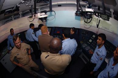 | Keywords: US Navy 100616-N-4482V-009 Rear Adm. Jeffery.jpg en MORGAN CITY La June 16 2010 Rear Adm Jeffery Scott Jones left director of the Coalition Naval Advisory Transition Team Mission observes Iraqi sailors training inside a full mission bridge trainer during a 90-day operations and maintenance training program in Morgan City La The Iraqi navy is preparing to receive their first 35-meter patrol boat in August 2010 The training is coordinated through Naval Education and Training Security Assistance Field Activity Naval Air Warfare Center Training Systems Division Naval Sea Systems Command and Swiftships Shipbuilding U S Navy photo by Steve Vanderwerff/Released 2010-06-16 100616-N-4482V-009 Navy http //www navy mil/view_image asp id 87441 U S Navy photo by Steve Vanderwerff PD-USGov-Military-Navy Naval Air Warfare Center Training Systems Division Morgan City Louisiana Jeffery Jones |