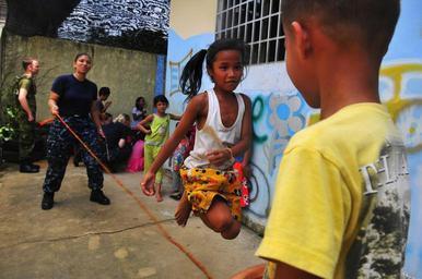 | Keywords: US Navy 100617-N-6597H-514 A Cambodian child plays jump rope with Aviation Boatswain's Mate (Handling) 1st Class Yissel Castanon.jpg en SIHANOUKVILLE Cambodia June 17 2010 A Cambodian child plays jump rope with Aviation Boatswain's Mate Handling 1st Class Yissel Castanon embarked aboard the Military Sealift Command hospital ship USNS Mercy T-AH 19 during a Pacific Partnership 2010 community service event at the Goodwill School Pacific Partnership is the fifth in a series of annual U S Pacific Fleet humanitarian and civic assistance endeavors to strengthen regional partnerships U S Navy photo by Mass Communication Specialist 2nd Class Jon Husman/Released 2010-06-17 100617-N-6597H-514 Navy http //www navy mil/view_image asp id 87228 U S Navy photo by Mass Communication Specialist 2nd Class Jon Husman PD-USGov-Military-Navy Aboard USNS Mercy T-AH-19 Women in the United States Navy Girls' arms People with windows People with structures Colorful clothing female People wearing bracelets Ponytails Groups of people Military people of the United States with children |