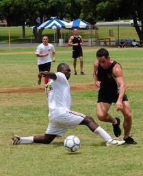 | Keywords: US Navy 100629-N-7200S-130 A sailor from the Australian Navy Underwater Salvage Team, right, tries to advance the ball past a Sailor from the guided-missile frigate USS McClusky (FFG 41).jpg en PEARL HARBOR Hawaii June 29 2010 A sailor from the Australian Navy Underwater Salvage Team right tries to advance the ball past a Sailor from the guided-missile frigate USS McClusky FFG 41 during a morale welfare and recreation soccer tournament as part of an in-port period of Rim of the Pacific RIMPAC 2010 RIMPAC is the world's largest international maritime exercise RIMPAC is a biennial multinational exercise designed to strengthen regional partnerships and improve interoperability U S Navy photo by Mass Communication Specialist 2nd Benjamin Stevens/Released 2010-06-29 100629-N-7200S-130 Navy http //www navy mil/view_image asp id 87970 U S Navy photo by Mass Communication Specialist 2nd Benjamin Stevens PD-USGov-Military-Navy USS McClusky FFG-41 |