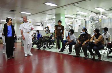 | Keywords: US Navy 100718-N-6410J-085 U.S. Consul General Kristen F. Bauer speaks with Capt. Jeffery Paulson, commanding officer of the Medical Treatment Facility aboard the Military Sealift Command hospital ship USNS Mercy (T-AH 19),.jpg en INDONESIA July 18 2010 U S Consul General Kristen F Bauer speaks with Capt Jeffery Paulson commanding officer of the Medical Treatment Facility aboard the Military Sealift Command hospital ship USNS Mercy T-AH 19 while on a tour of the ship during Pacific Partnership 2010 Pacific Partnership 2010 is the fifth in a series of annual U S Pacific Fleet endeavors conducted in Indonesia as a disaster relief exercise aimed at strengthening regional relationships and partner nations in Southeast Asia and Oceania U S Navy photo by Mass Communication Specialist 3rd Class Matthew Jackson/Released 2010-07-18 100718-N-6410J-085 Navy http //www navy mil/view_image asp id 89117 U S Navy photo by Mass Communication Specialist 3rd Class Matthew Jackson PD-USGov-Military-Navy Aboard USNS Mercy T-AH-19 Kristen F Bauer Jeffery W Paulson |