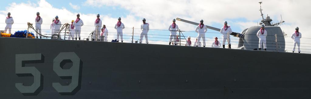 | Keywords: US Navy 100806-N-3666S-020 Sailors man the rails aboard the guided-missile destroyer USS Russell (DDG 59) as the ship returns to Joint Base Pearl Harbor-Hickam.jpg en PEARL HARBOR Aug 6 2010 Sailors man the rails aboard the guided-missile destroyer USS Russell DDG 59 as the ship returns to Joint Base Pearl Harbor-Hickam after a scheduled seven-month deployment in the U S 5th and 7th Fleet areas of responsibility While on deployment Russell conducted operations in conjunction with coalition partners deployed to the Middle East and with the Dwight D Eisenhower Carrier Strike Group U S Navy photo by Mass Communication Specialist 2nd Class Robert Stirrup/Released 2010-08-06 100806-N-3666S-020 Navy http //www navy mil/view_image asp id 90100 U S Navy photo by Mass Communication Specialist 2nd Class Robert Stirrup PD-USGov-Military-Navy Aboard USS Russell DDG-59 Manning the rail in the United States Navy |