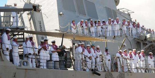 | Keywords: US Navy 100806-N-3666S-048 Sailors man the rails aboard the guided-missile destroyer USS Russell (DDG 59) as the ship returns to Joint Base Pearl Harbor-Hickam.jpg en PEARL HARBOR Aug 6 2010 Sailors man the rails aboard the guided-missile destroyer USS Russell DDG 59 as the ship returns to Joint Base Pearl Harbor-Hickam after a scheduled seven-month deployment in the U S 5th and 7th Fleet areas of responsibility While on deployment Russell conducted operations in conjunction with coalition partners deployed to the Middle East and with the Dwight D Eisenhower Carrier Strike Group U S Navy photo by Mass Communication Specialist 2nd Class Robert Stirrup/Released 2010-08-06 100806-N-3666S-048 Navy http //www navy mil/view_image asp id 90072 U S Navy photo by Mass Communication Specialist 2nd Class Robert Stirrup PD-USGov-Military-Navy Aboard USS Russell DDG-59 Manning the rail in the United States Navy |