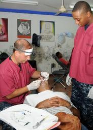 | Keywords: US Navy 100814-N-3265K-013 Cmdr. Scott Thomas, a dental officer, and Hospitalman Rashad Thompson, both assigned to the multi-purpose amphibious assault ship USS Iwo Jima (LHD 7).jpg en COVENAS Colombia Aug 14 2010 Cmdr Scott Thomas a dental officer and Hospitalman Rashad Thompson both assigned to the multi-purpose amphibious assault ship USS Iwo Jima LHD 7 perform dental work on a Colombian man at the Continuing Promise medical site Escuela Ismael Contreas Iwo Jima is operating off the coast of Colombia supporting the Continuing Promise 2010 humanitarian civic assistance mission The assigned medical and engineering staff embarked aboard Iwo Jima are working with partner nation teams to provide medical dental veterinary and engineering assistance to several different nations U S Navy photo by Mass Communication Specialist 3rd Class Travis J Kuykendall/Released 2010-08-14 100814-N-3265K-013 Navy http //www navy mil/view_image asp id 90356 U S Navy photo by Mass Communication Specialist 3rd Class Travis J Kuykendall PD-USGov-Military-Navy Aboard USS Iwo Jima LHD-7 |