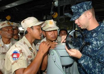| Keywords: US Navy 101026-N-9156C-003 Quartermaster 2nd Class John Ostgard explains navigation equipment on the bridge of the guided-missile frigate USS Cromm.jpg en SIHANOUKVILLE Cambodia Oct 26 2010 Quartermaster 2nd Class John Ostgard explains navigation equipment on the bridge of the guided-missile frigate USS Crommelin FFG 37 to visiting Royal Cambodian naval officers during Cooperation Afloat Readiness and Training CARAT Cambodia 2010 The visit is part of the process to familiarize watch standers of both countries with each other's procedures before the first dedicated underway exercise by U S and Royal Cambodian Navy ships CARAT is a series of bilateral exercises held annually in Southeast Asia to strengthen relationships and enhance force readiness U S Navy photo by Mass Communication Specialist 1st Class Robert Clowney/Released 2010-10-26 101026-N-9156C-003 Navy http //www navy mil/view_image asp id 93274 U S Navy photo by Mass Communication Specialist 1st Class Robert Clowney PD-USGov-Military-Navy USS Crommelin FFG-37 |