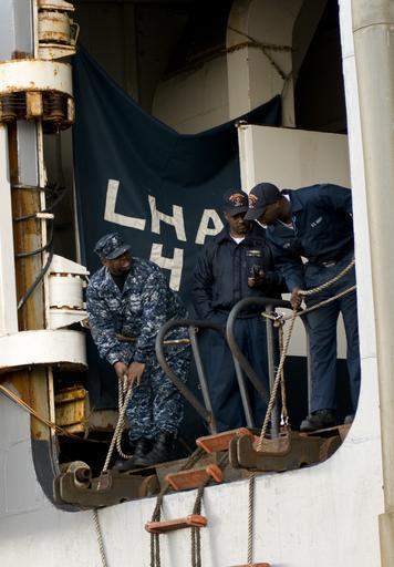 Keywords: US Navy 101116-N-3852A-156 Sailors assigned to the amphibious assault ship USS Nassau (LHA 4) bring down a ladder while preparing to get underway.jpg en NORFOLK Nov 16 2010 Sailors assigned to the amphibious assault ship USS Nassau LHA 4 bring down a ladder while preparing to get underway U S Navy photo by Mass Communication Specialist 1st Class Rebekah Adler/Released 2010-11-16 101116-N-3852A-156 Navy http //www navy mil/view_image asp id 94267 U S Navy photo by Mass Communication Specialist 1st Class Rebekah Adler PD-USGov-Military-Navy Aboard USS Nassau LHA-4